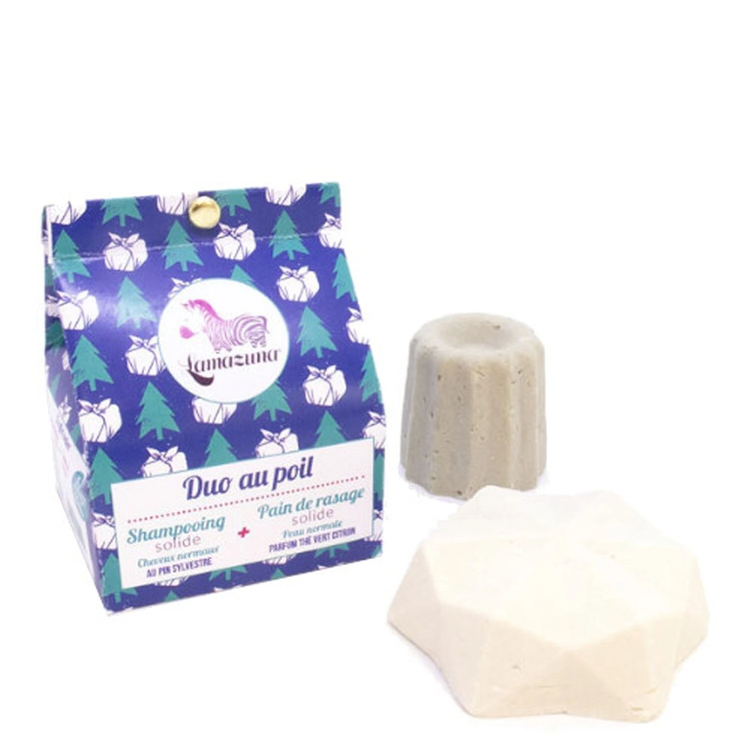 Composé de d’un shampoing au pin sylvestre et d’un pain de rasage.