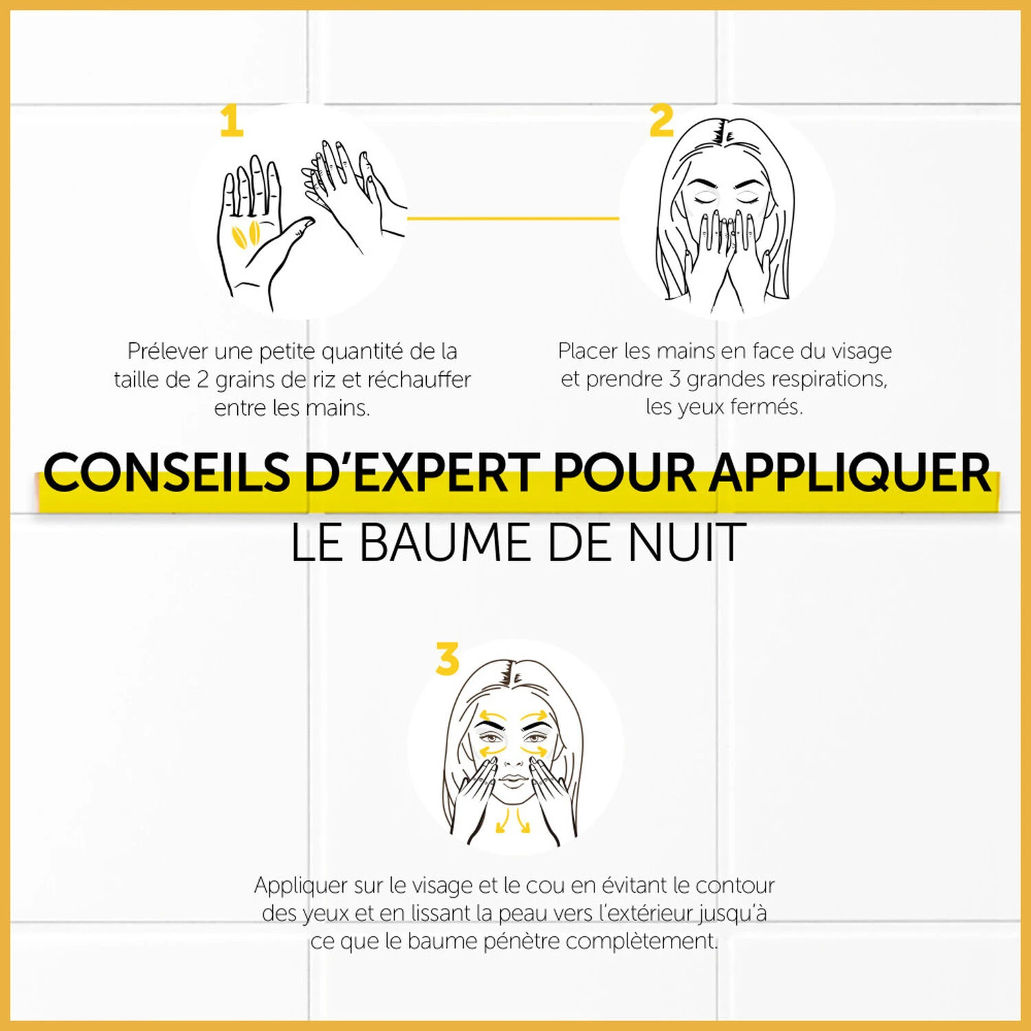 Chaque soir, prélever une perle de baume de nuit. Réchauffer dans les mains et respirer 3 fois. Appliquer en effleurages sur le visage et cou.