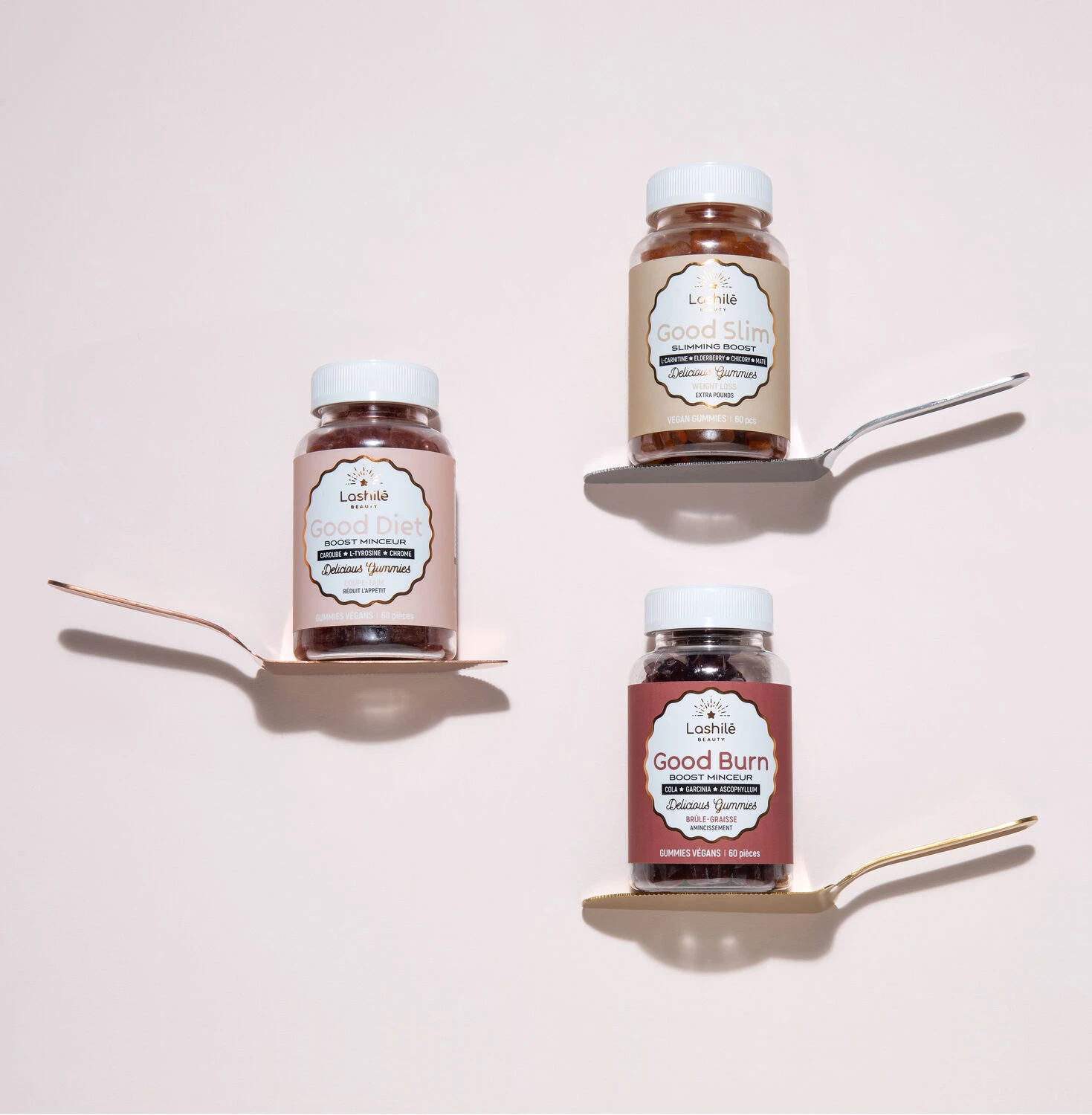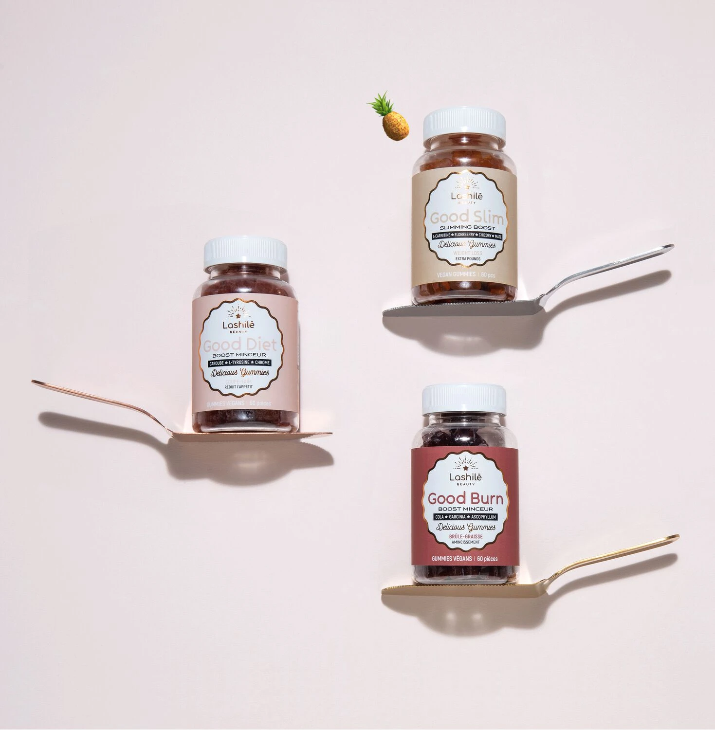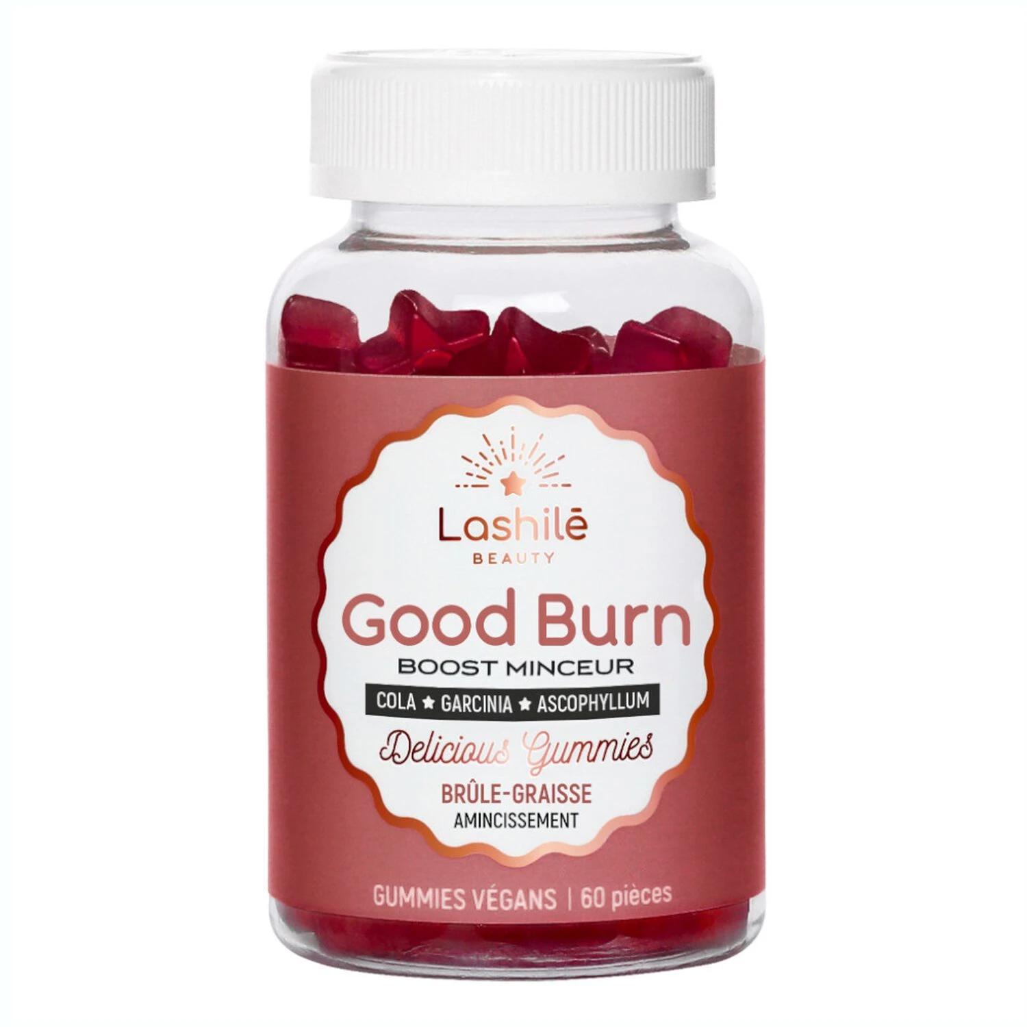 Agent de charge : maltitol – Extrait sec de tige d’ananas (Ananas comosus (L.) Merr.) – Agent gélifiant : pectine – Poudre de graine de cola (Cola nitida (Vent.) Schott et Endl.) – Extrait sec d’écorce de fruit de Garcinia (Garcinia cambogia) – Concentré (carotte et patate douce) – Arôme naturel – Agent acidifiant : citrate de sodium – Extrait d’ascophyllum (Ascophyllum nodosum L.) (traces de mollusques, poissons, crustacés) – Agent acidifiant : acide citrique – Agent d’enrobage : cire de carnauba. FORMULE SANS SUCRES AJOUTÉS. CONTIENT DES SUCRES NATURELLEMENT PRÉSENTS.