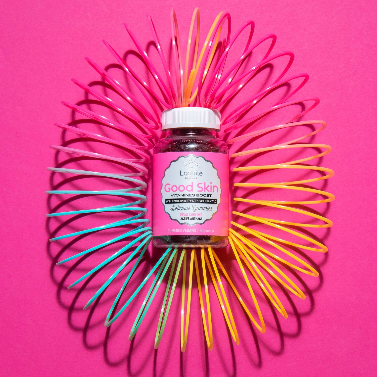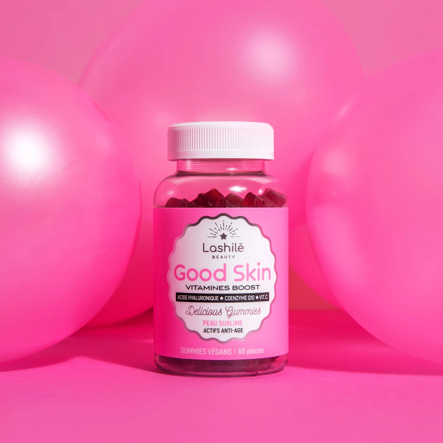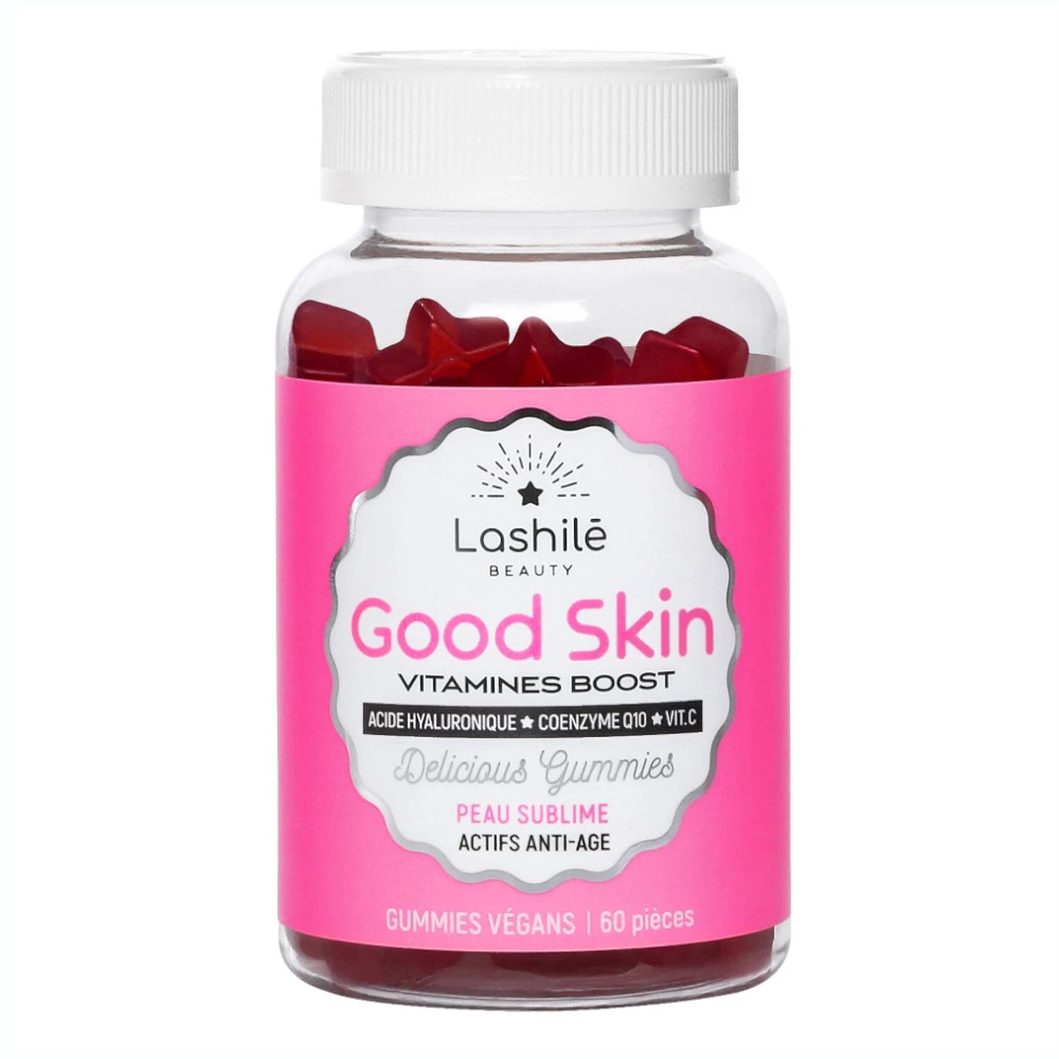 Sirop de blé – Sucre – Fructo-oligosaccharides – Coenzyme Q10 – Gélifiant : pectine – Acide hyaluronique – Arôme naturel – Jus concentré de carotte noire – Acide ascorbique (vitamine C) – Acétate de dl-alpha-tocopherol (vitamine E) – Acidifiant : acide citrique – Citrate de sodium – Antioxy- dant : extrait riche en tocopérol – Agent d’enrobage : cire de carnauba, huiles végétales (contient huiles de noix de coco et de colza) et antioxydant : alpha-tocophérol.