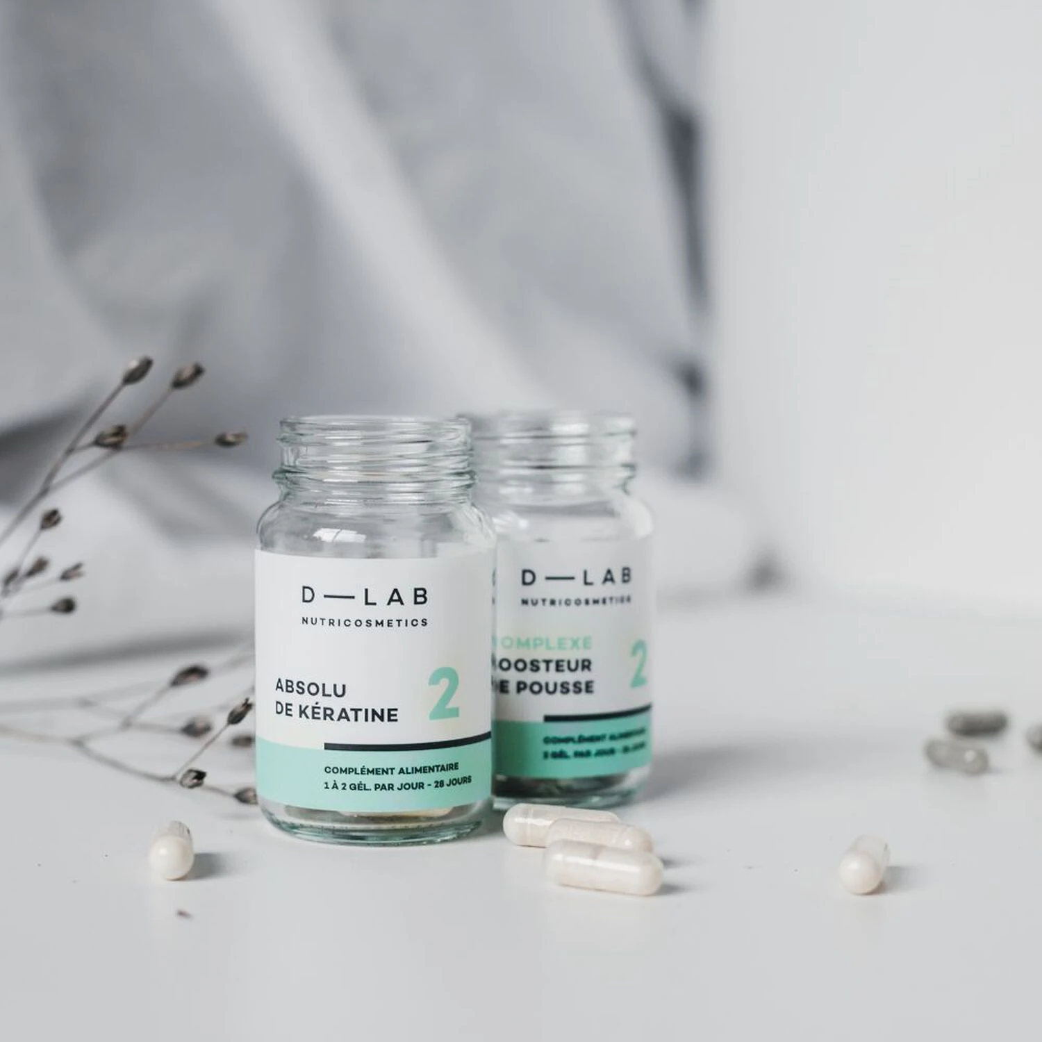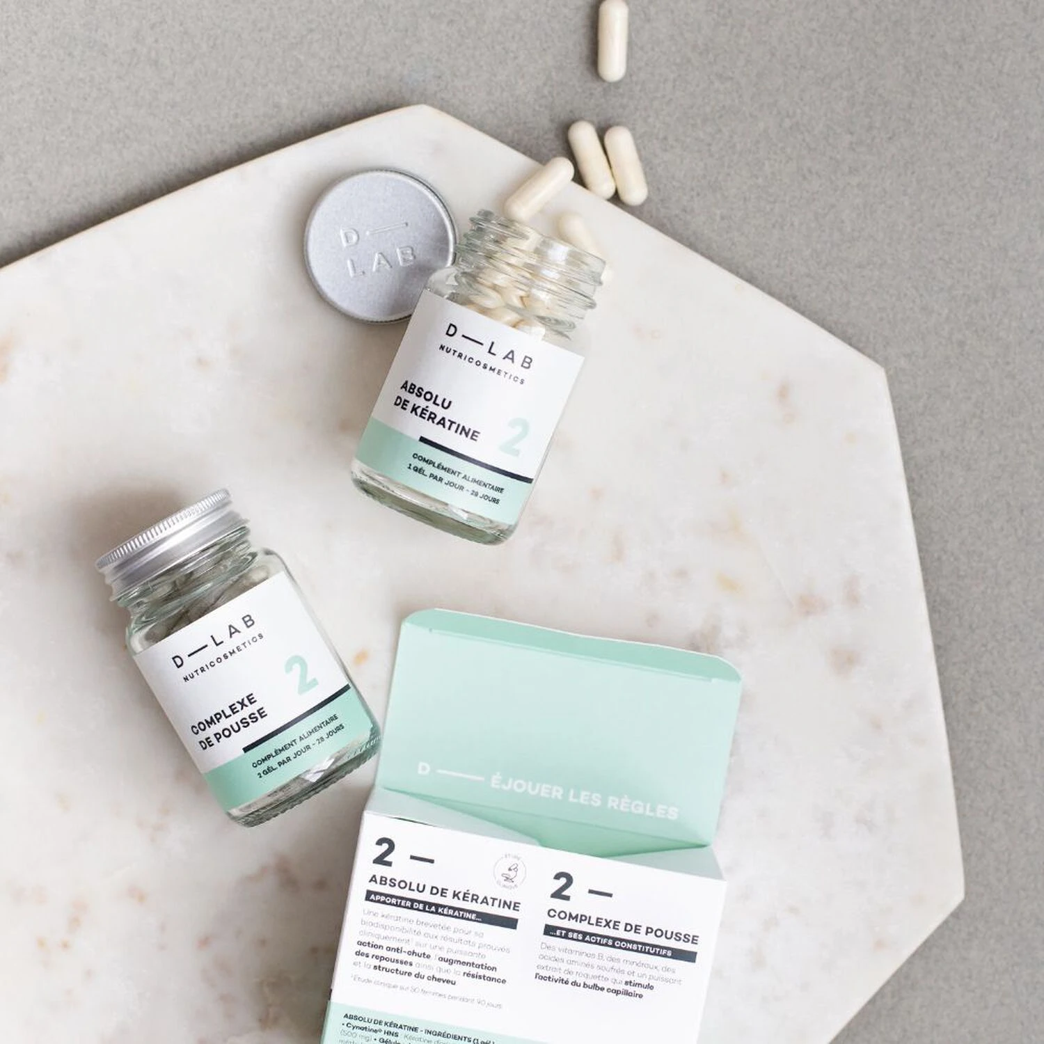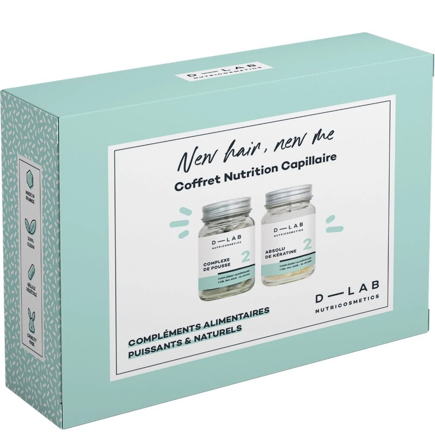 Pour 2 gélules : Roquette* (parties aériennes) – Eruca sativa (400 mg) • Bambou (jeune pousse) – Bambusa arundinacea (200 mg) • Gélule végétale : Hydroxypropylméthylcellulose • L-méthionine (100 mg) • L-cystine (100 mg) • L-lysine (60 mg) • L-arginine (60 mg) • Lithothamne (algue) – Phymatolithon calcareum (30 mg) • Spiruline (algue) – Spirulina platensis (30 mg) • Chlorella (algue) – Chlorella vulgaris (30 mg) • Sels thermaux de Vichy (30 mg) • Antiagglomérant : Stéarate de magnésium • Vitamine B5 (12 mg) 200% VNR • Vitamine B9 (200 µg) 100% VNR • Vitamine B8* (50 µg) 100% VNR.