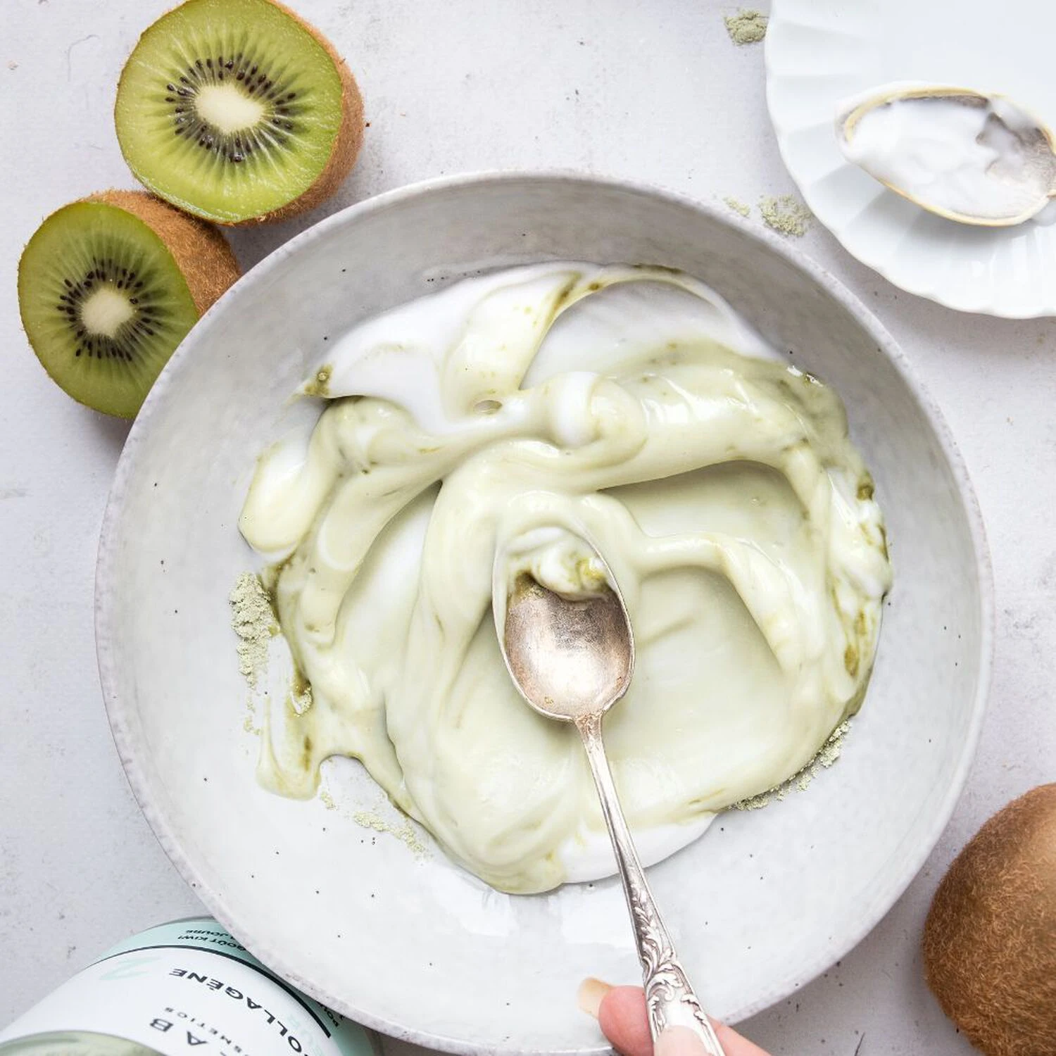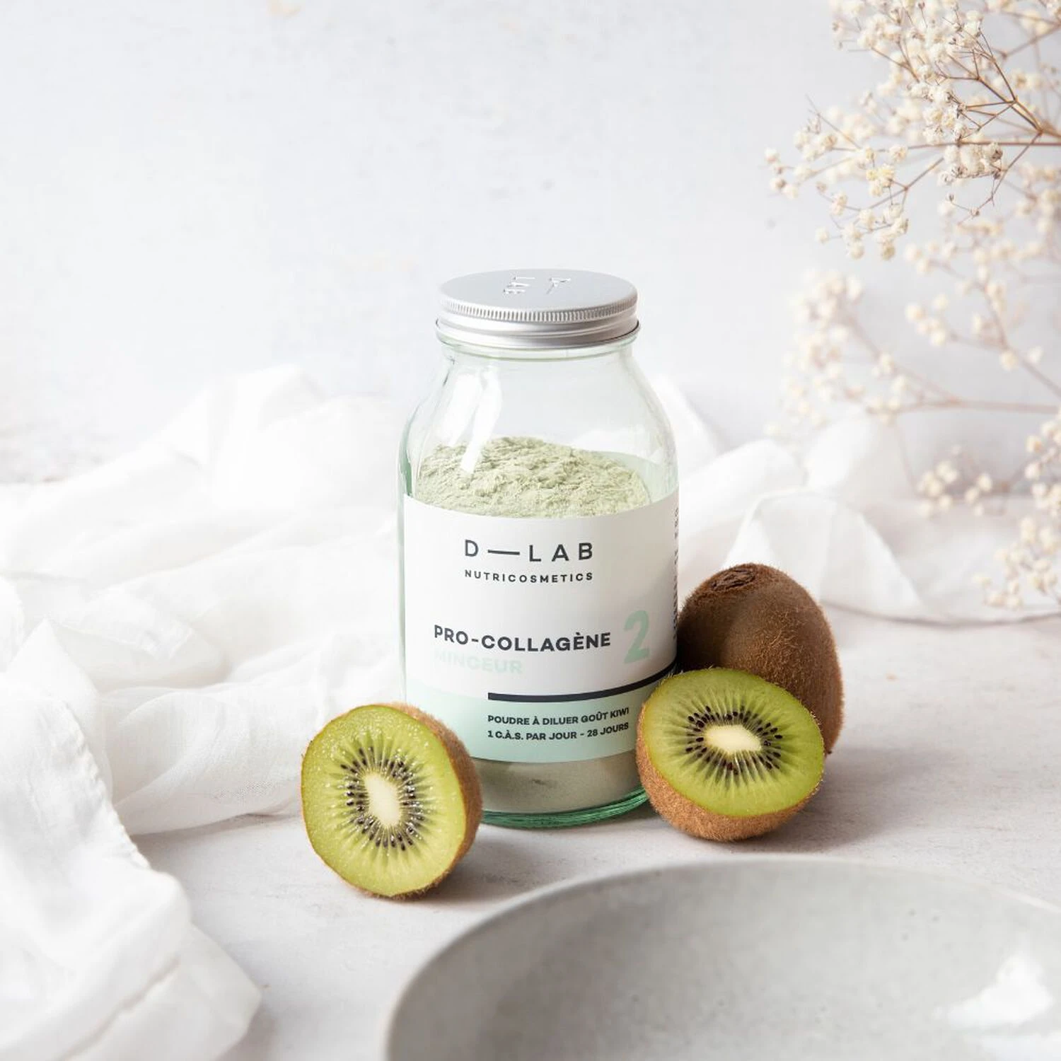 (1 c.à.s. soit 6,1 g) : • Hydrolysat de collagène 1,88 g et oligopeptides d’élastine 120 mg ( poisson , mollusque , crustacé ) • Fructo-oligosaccharides 2 g • Extrait de maté – Ilex paraguariensis 800 mg (ESP1 : 4,8 g) titré en caféine 40 mg ; feuille • Arôme naturel kiwi • Poudre d’acérola – Malpighia glabra 235,3 mg titré en Vitamine C 40 mg 50% AR2 ; fruit • Denrée alimentaire colorante (concentré de carthame, spiruline) • Poudre de jus de kiwi – Actinidia chinensis 100 mg ; fruit • Arôme naturel • SOD de Melon – Cucumis melo 480 IU • Chlorure de chrome 0,21 mg dont Chrome 40 µg 100% AR2.